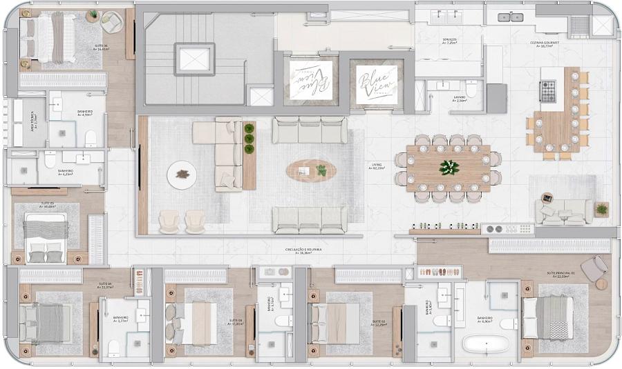 O Blue View redefine o conceito de "Frente Mar" com um design esguio, sofisticado e plantas projetadas para maximizar a luz e a ventilação natural. É a materialização do luxo em sua forma mais pura.