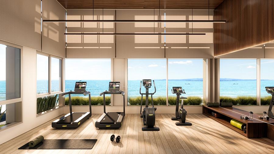 Studio fitness equipado. Aprecie a vista para o mar.