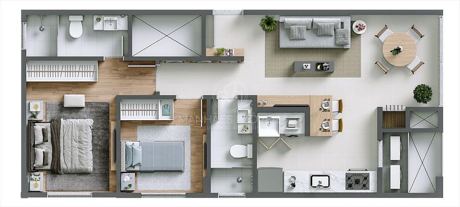 Planta humanizada do apartamento tipo 3 | 62m² privativos