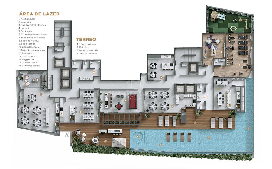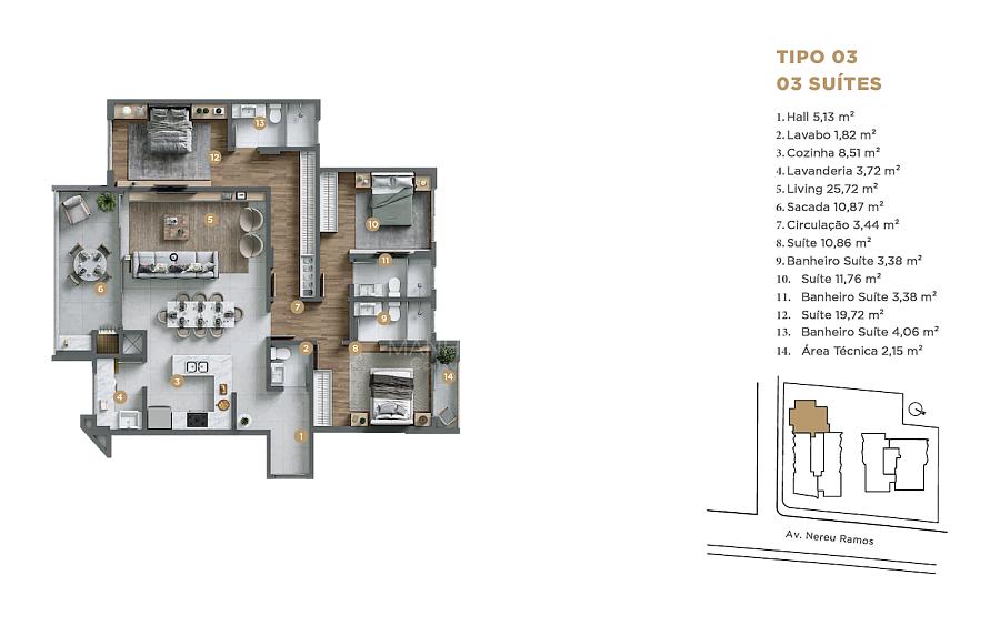 Planta humanizada do Apartamento Tipo 03 | 131,93m² priv.