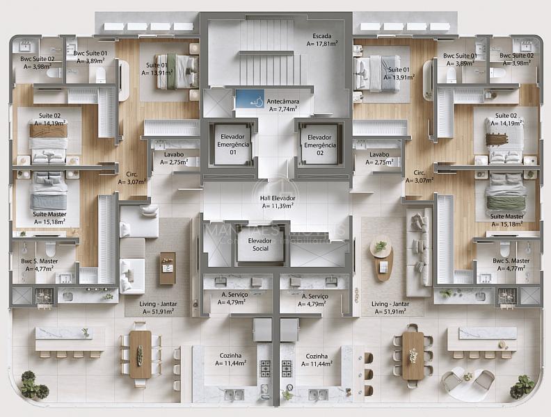 Planta humanizada dos Apartamentos Tipo | 144,35m² priv.