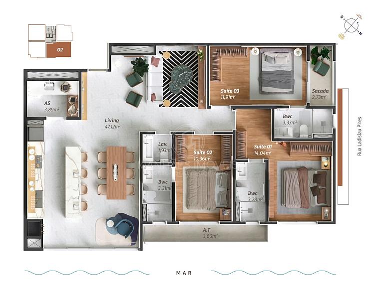 Planta humanizada do Apartamento Tipo 02 - 120,46m² priv.