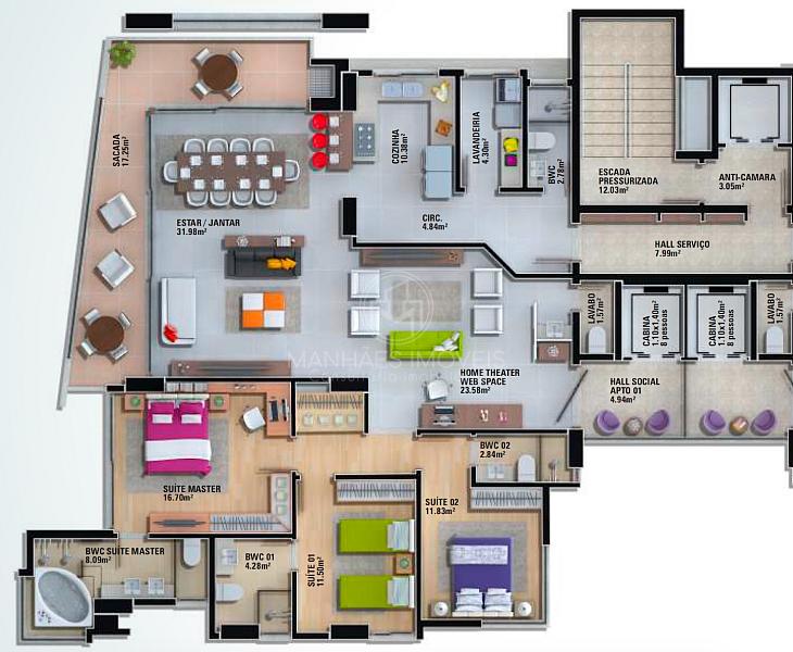 Planta humanizada do Apartamento Tipo 1 | Torre Pacific - 187m² priv.