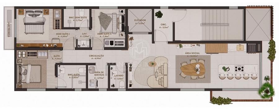 Planta humanizada do Apartamento Tipo | 98m² priv.