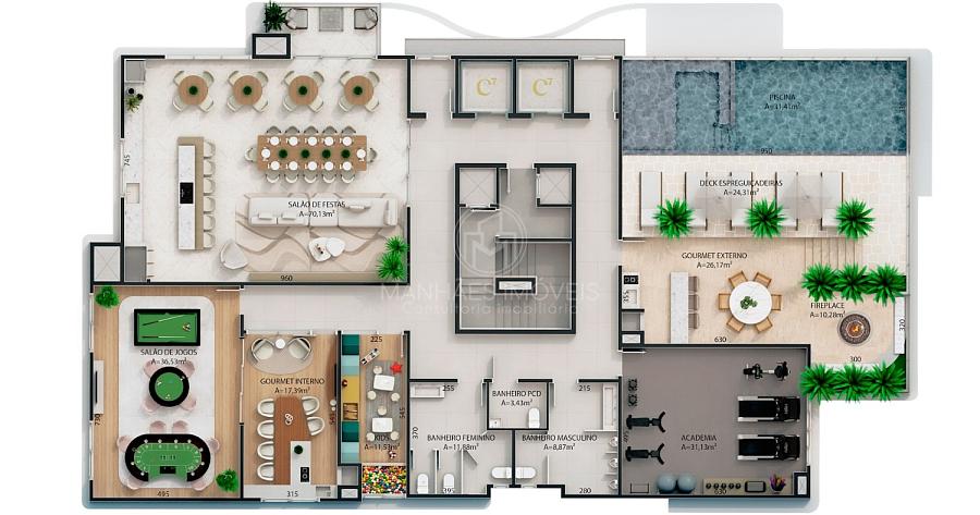 Imagem ilustrativa da implantação da área de lazer no rooftop.