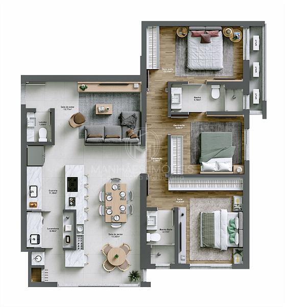 Planta humanizada dos Apartamentos Tipo 02 e 04 | 116,95m² priv.