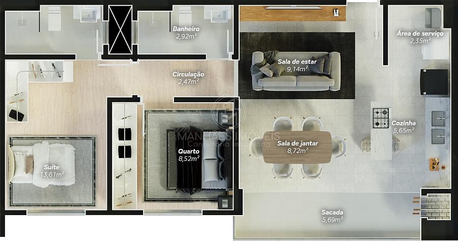 Planta humanizada do apartamento tipo - Finais 3A e 1B - 67,80 m² privativos