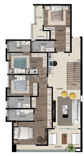 A Cobertura Duplex conta com 4 suítes, home office, sala íntima, 4 vagas de garagem + depósito e 332 m² de puro requinte. A área de lazer completa oferece: salão de festas com pé direito duplo, piscina com espaço gourmet, fitness, playground, sala de jogos e brinquedoteca. A cobertura que redefine o morar bem. Fale com a Manhães Imóveis.