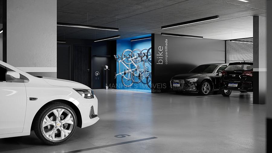 Bikes compartilhadas e estação de carregamento de carros
